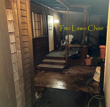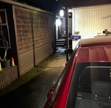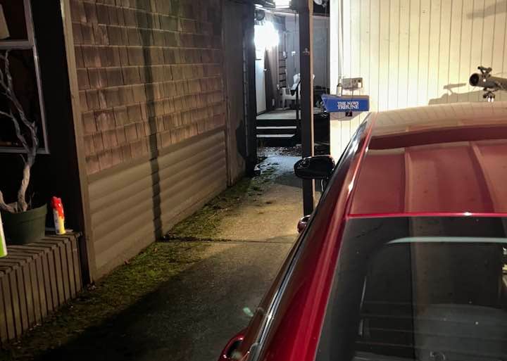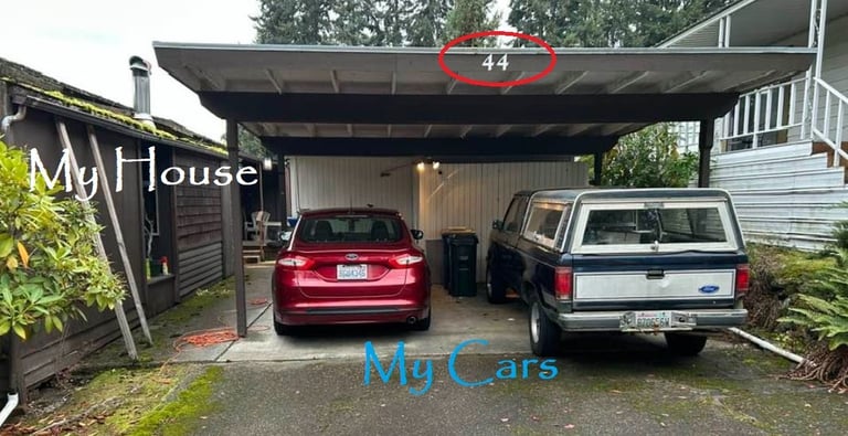 So, here's my house, from the street. Imagine for a moment that you lived here, that's your red Ford. You pull into the carport, shut the car off, open the door, climb out...what now? Do you walk to that door 15 feet away or do you go on a trek out in the rain and cold and dark because you don't actually live where you park your car?